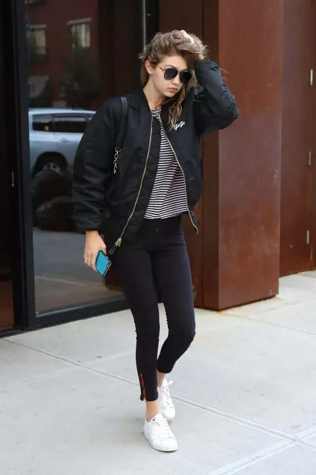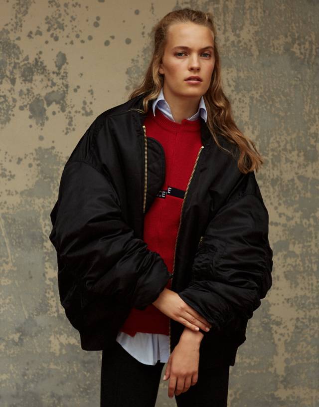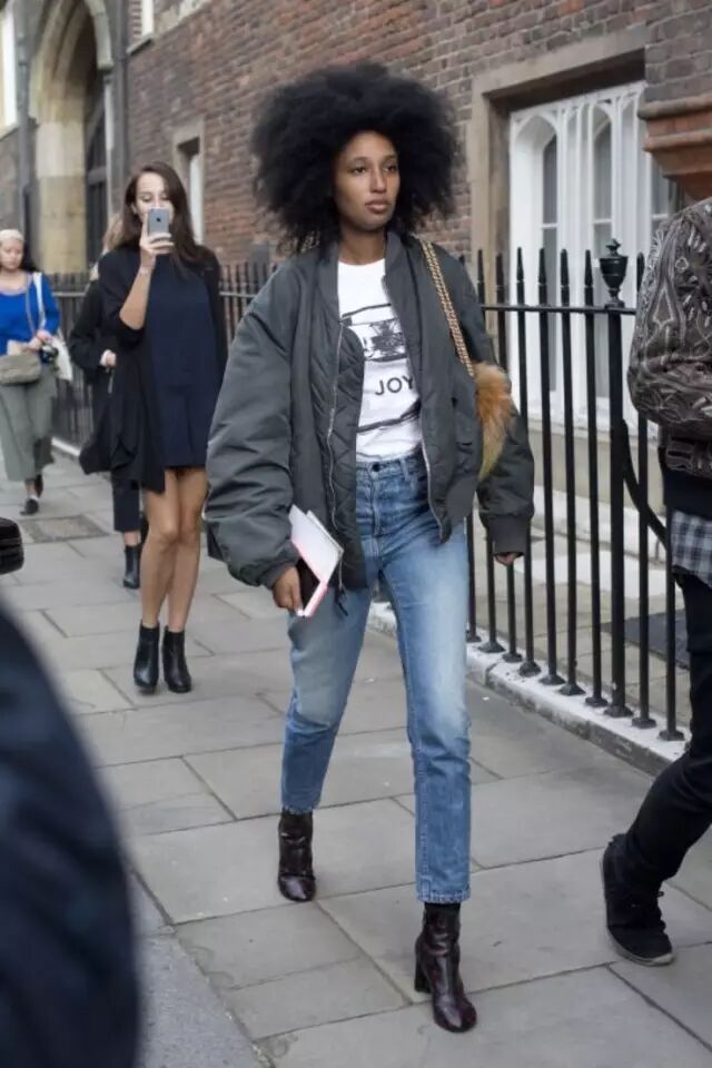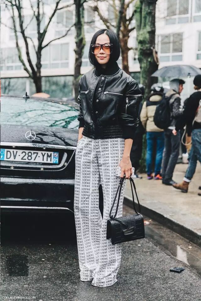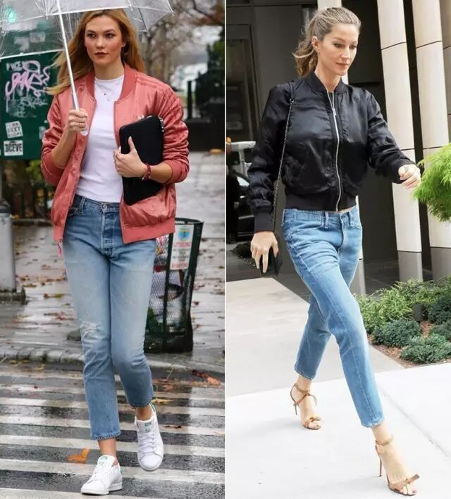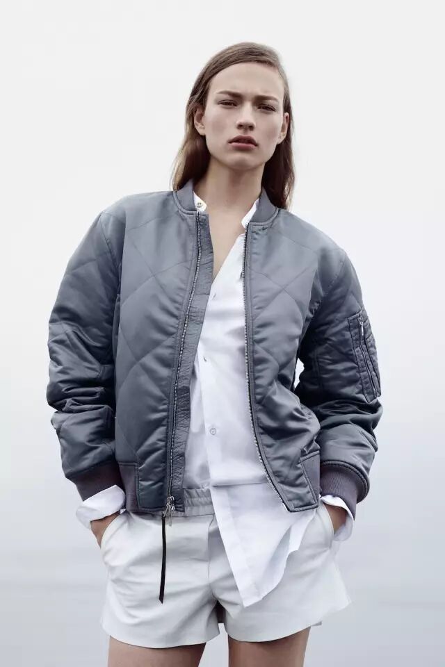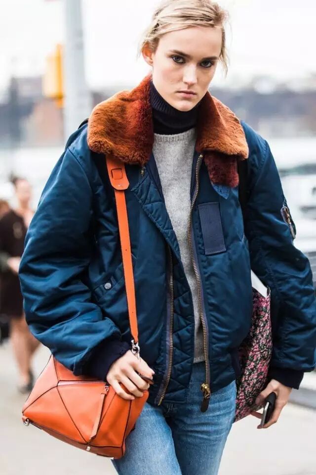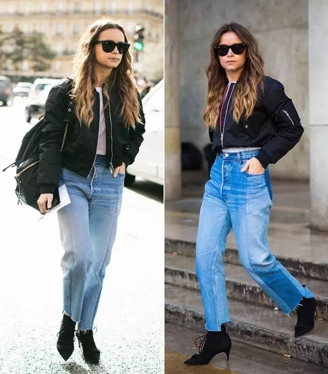因为飞行员夹克比较蓬,很多人一拿起它,总会忍不住搭配紧身裤,打造上松下紧的效果,做个cool girl。其实,