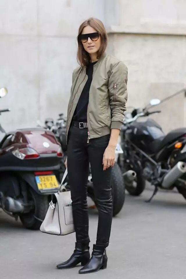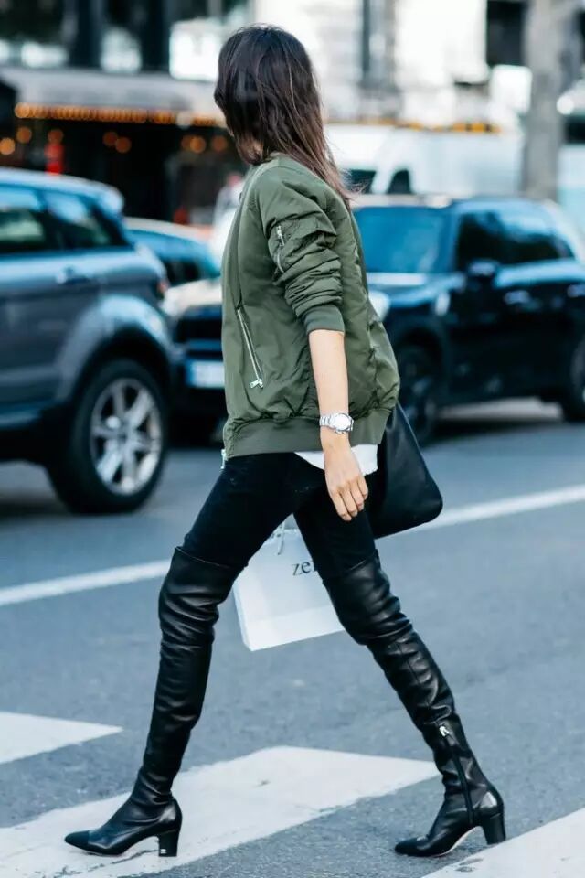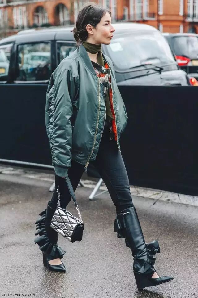 飞行员夹克 黑色紧身裤 黑色长靴的组合就更帅气了。▼