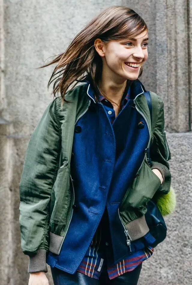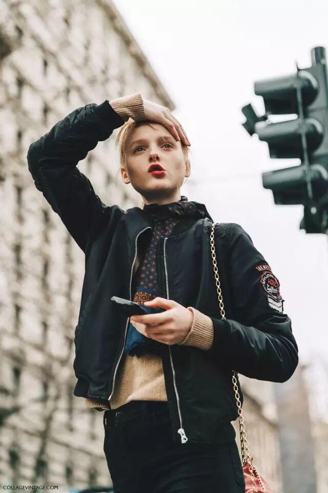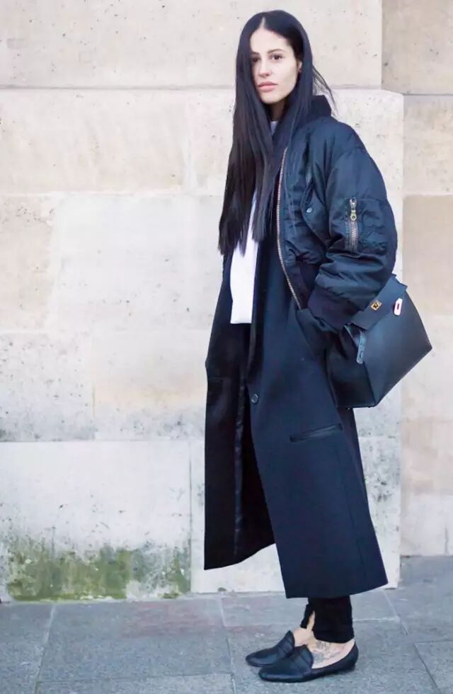 还有些更大胆的时装精,直接把飞行员夹克穿在大衣外面,外套搭外套。虽然很个性,但不太日常,普通人很难驾驭。▼