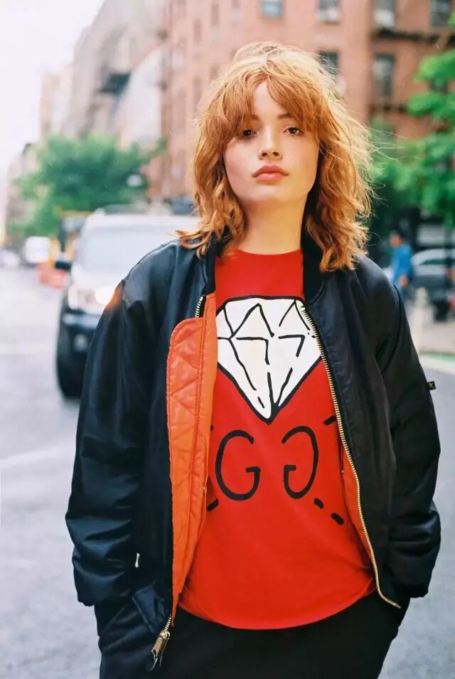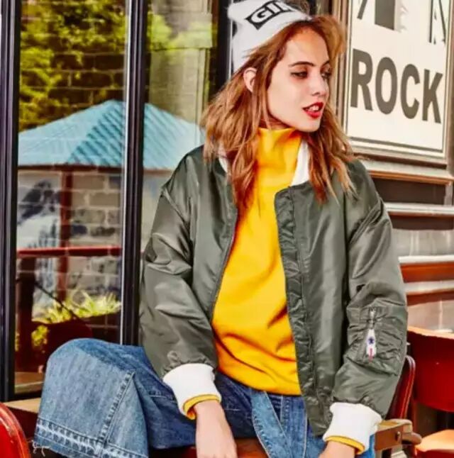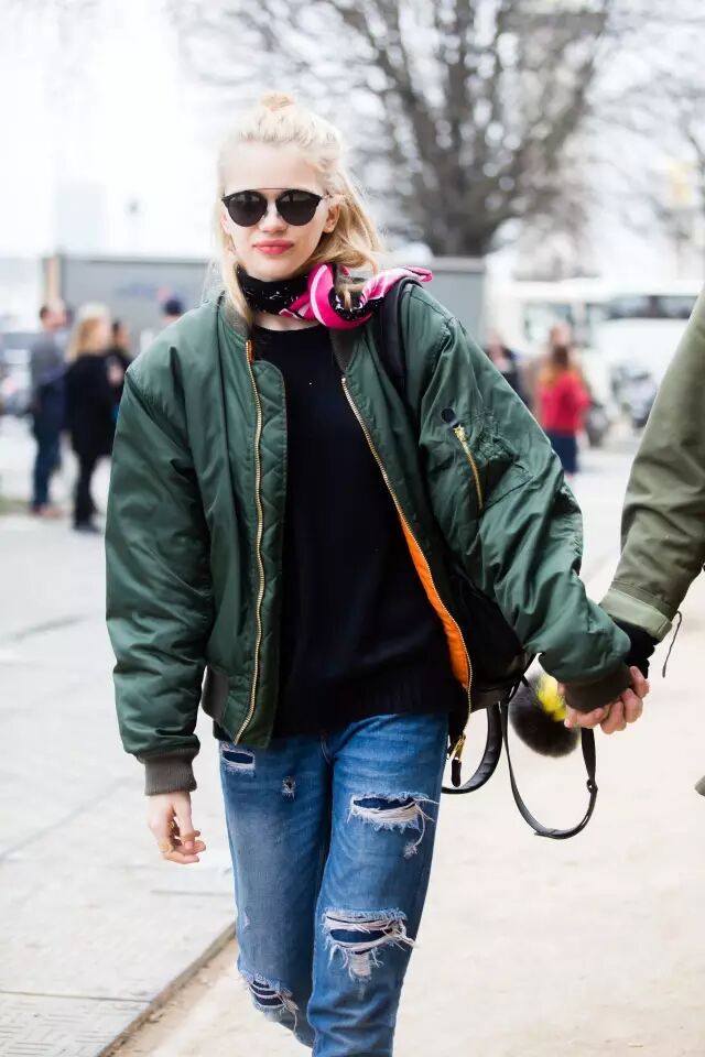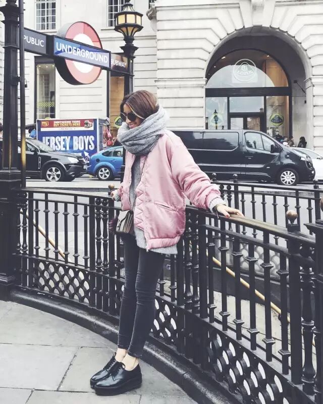 或者买一件颜色特别点的飞行员夹克。比如粉色款,内搭个灰色毛衣就足够温柔、美好。▼