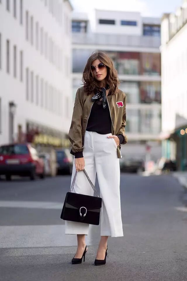 想更有气场一点,也可以试试用短款飞行员外套搭配阔腿裤。▼