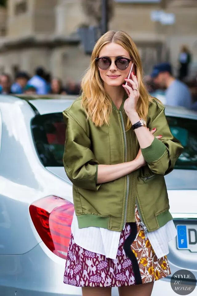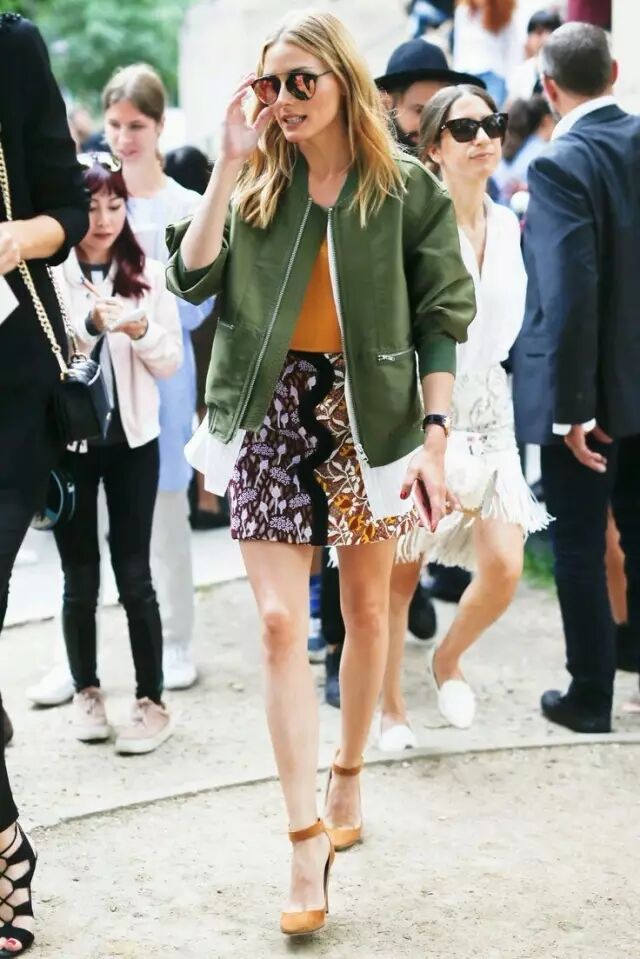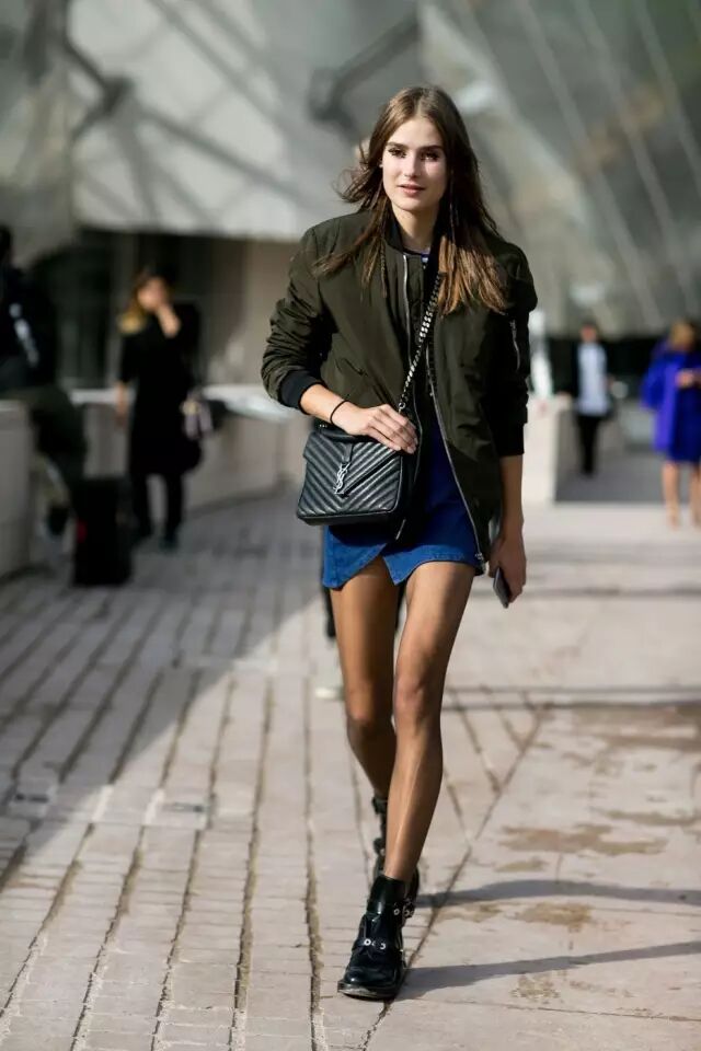 普通款式的飞行员夹克最好的裙装拍档是小短裙。军绿色飞行员夹克搭牛仔短裙,打造蓝绿配。▼