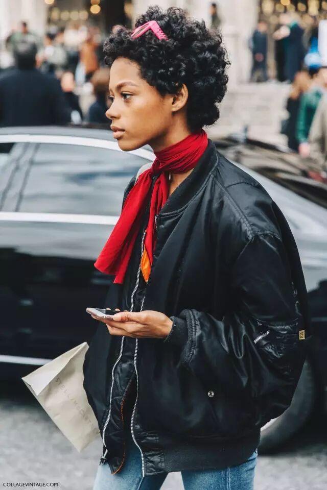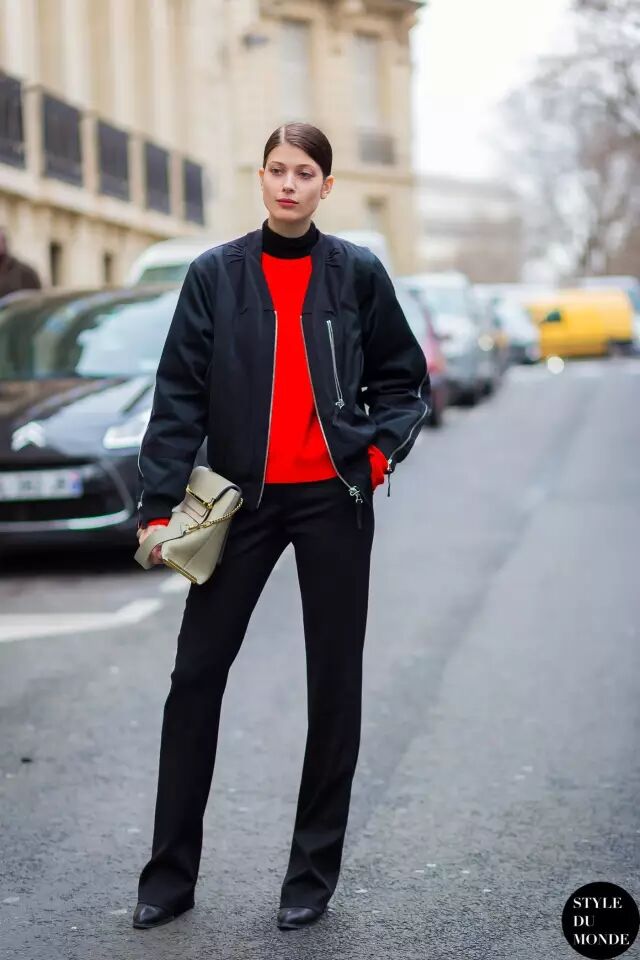快过年了嘛,很多人都想选一件红色单品。黑色的飞行员夹克可以配一件红色的内搭,红黑配,更有视觉冲击力~▼