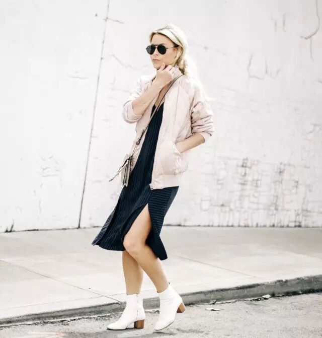 而稍微长一点的飞行员夹克搭连衣裙~还能穿出一点慵懒性感的感觉。▼
