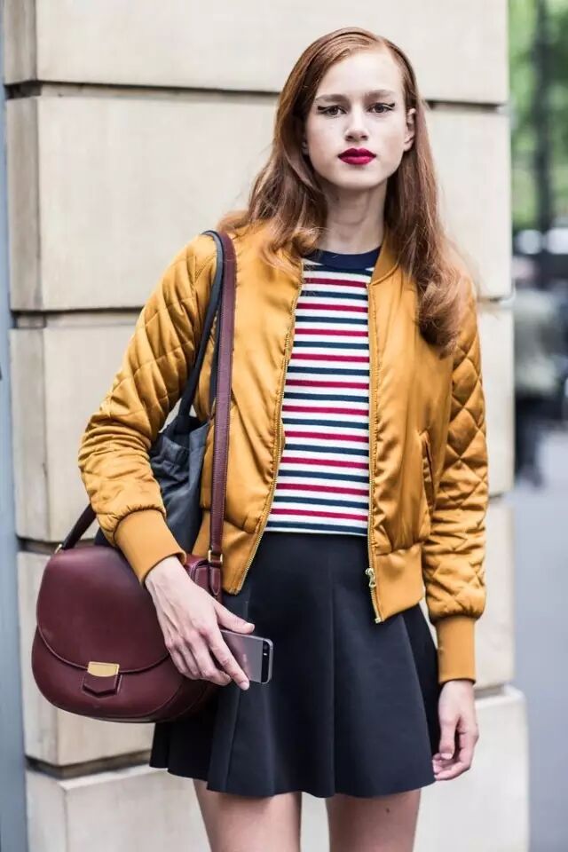 姜黄色的飞行员外套,可以搭配小黑裙,内搭选彩条纹T恤,很有少女感~▼