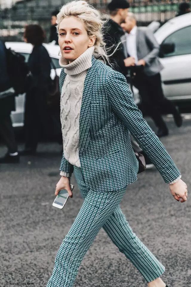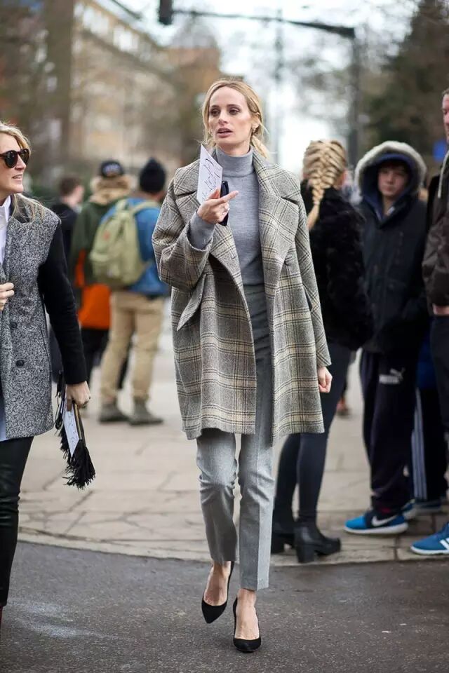 格纹小西装配大领口的高领毛衣,时髦翻倍。▼