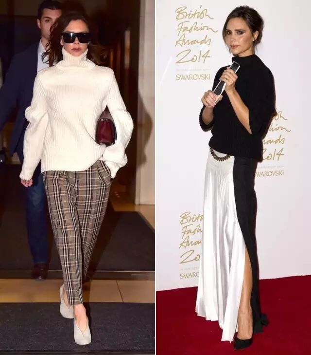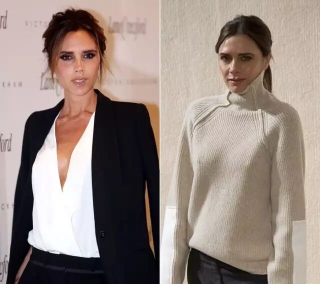 再来看看贝嫂。贝嫂的脖子长度属于普通程度,不长不短。但看对比图就很明显能看出,贝嫂穿窄高领会显得她有点耸肩,脖子也没有穿V领的时候看起来长。▼