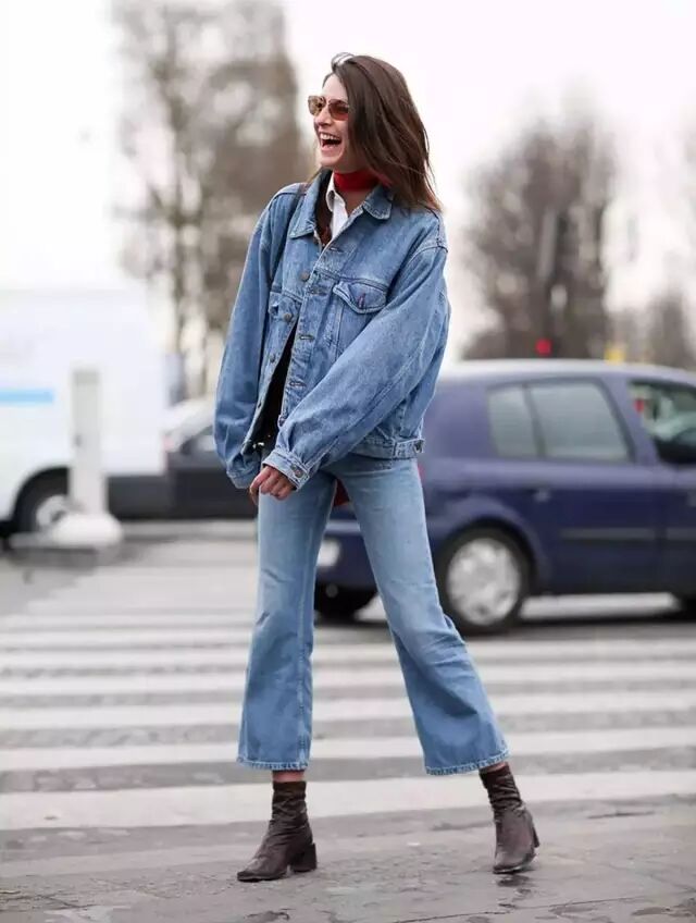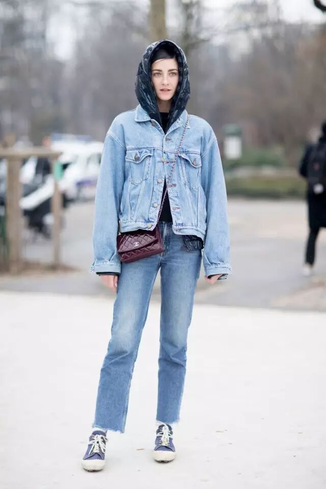 还有牛仔外套,oversized款的从前两年火到现在,街拍里一抓一大把。巴黎世家的这件褶皱款更是成为了爆款。▼
