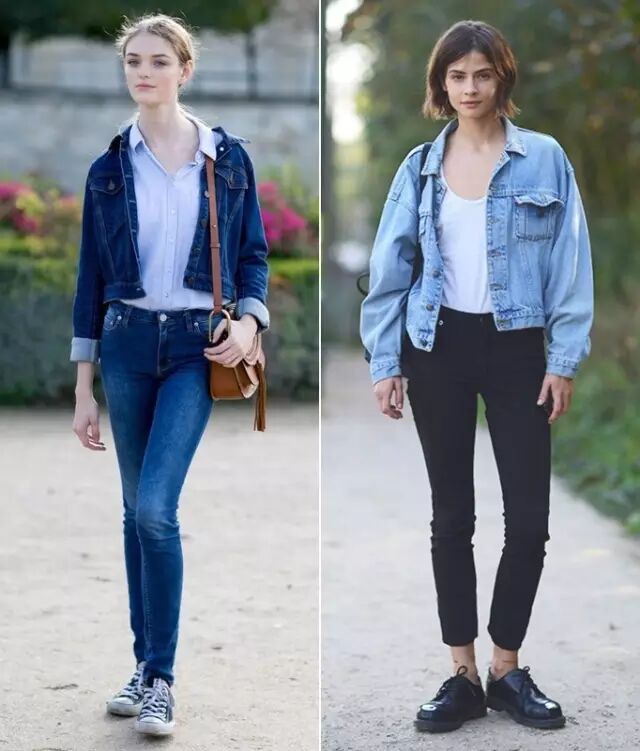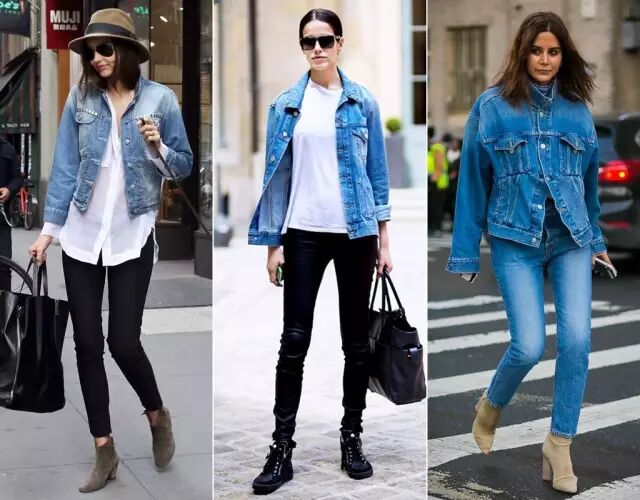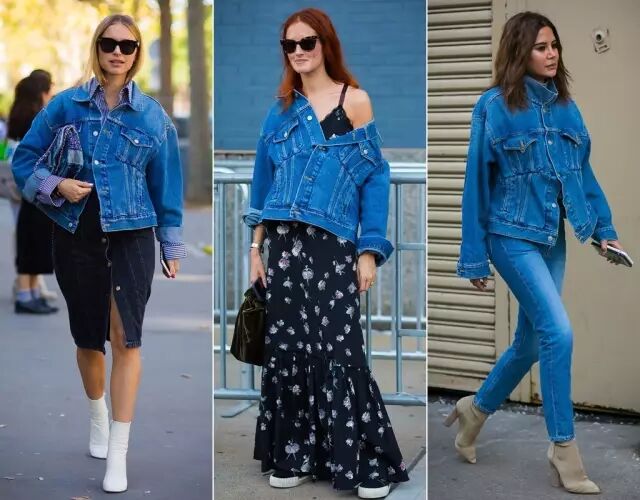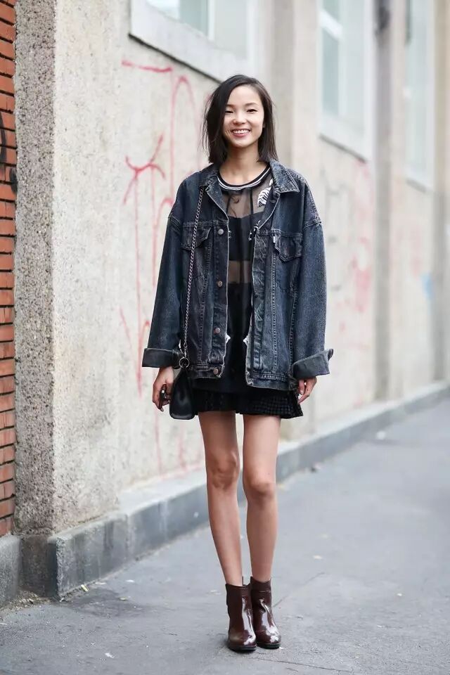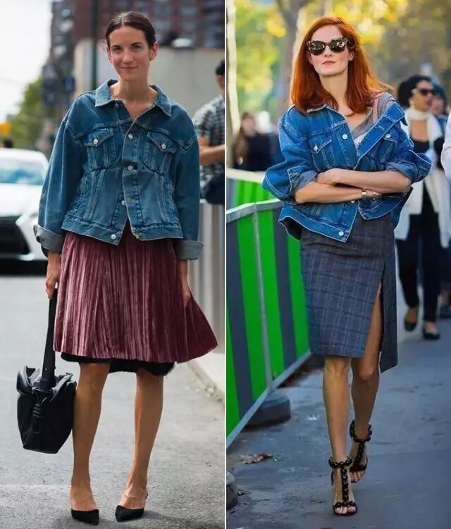 看个对比,最左边可儿穿的就是传统的牛仔外套。从左到右三张图可以看出,这两年牛仔外套的趋势明显是越来越长,越来越大。▼