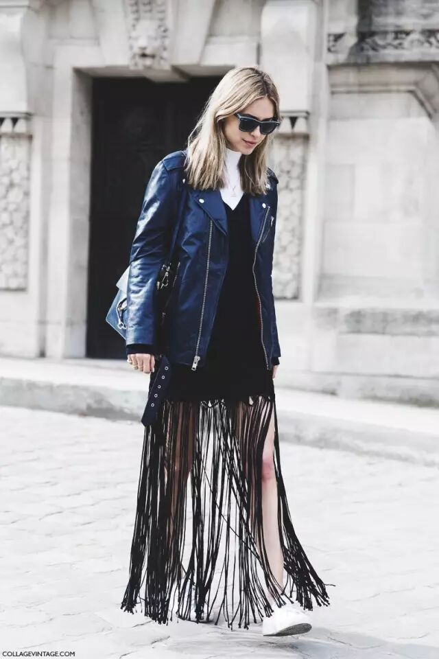 oversized机车皮衣还很适合搭配一些女人味爆棚的裙子,酷帅和风情的完美结合。▼