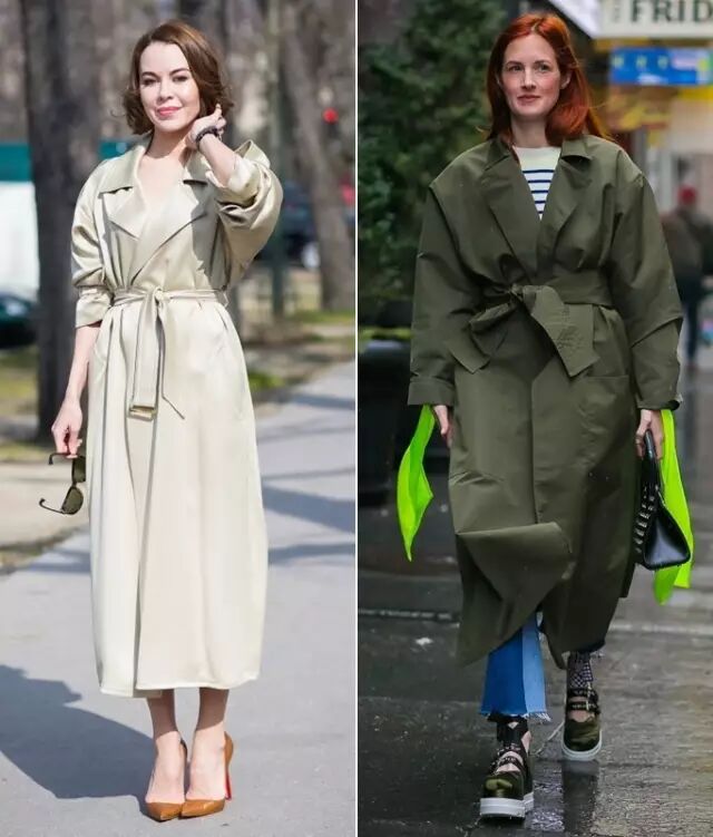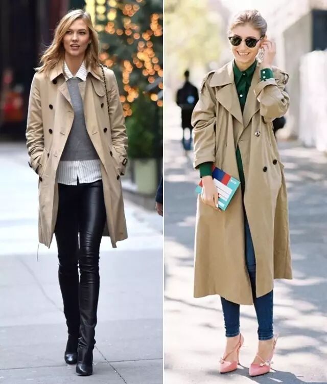 左边KK穿的就是经典款的风衣,版型修身,衣长在膝盖上一点。右边Jenny Walton穿的则是oversized款的,落肩,整体比较宽松,长度到小腿了。▼