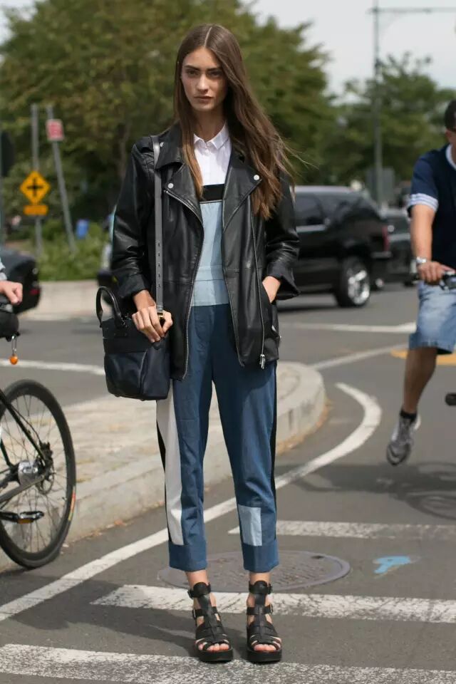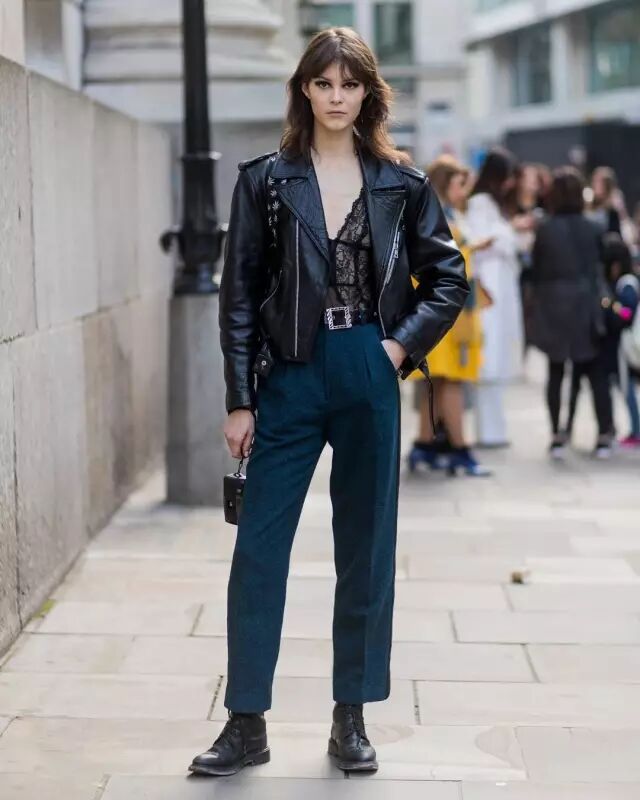 这种机车皮衣的最佳拍档是各种裤装。依旧帅气,还有一点嬉皮的感觉。说起来,跟牛仔外套一样,oversized款的都自带复古感。▼