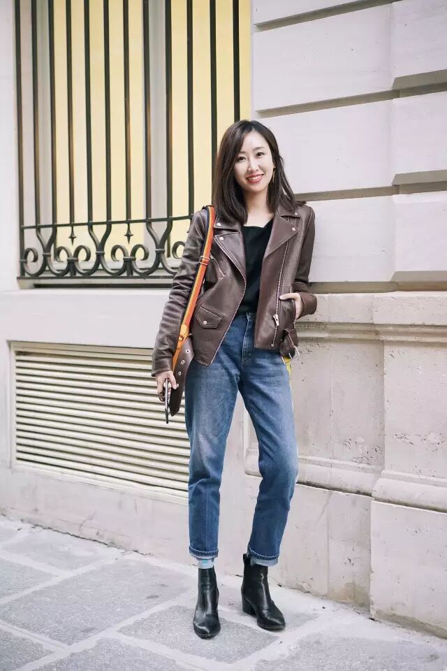 这是最日常也是最常见的搭配了。机车皮衣自带帅气属性,直接用它搭配牛仔裤、小黑靴等基本款,就可以出门了~▼