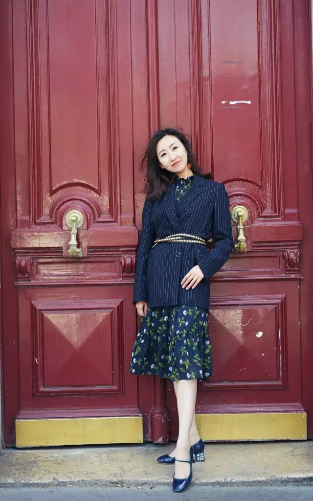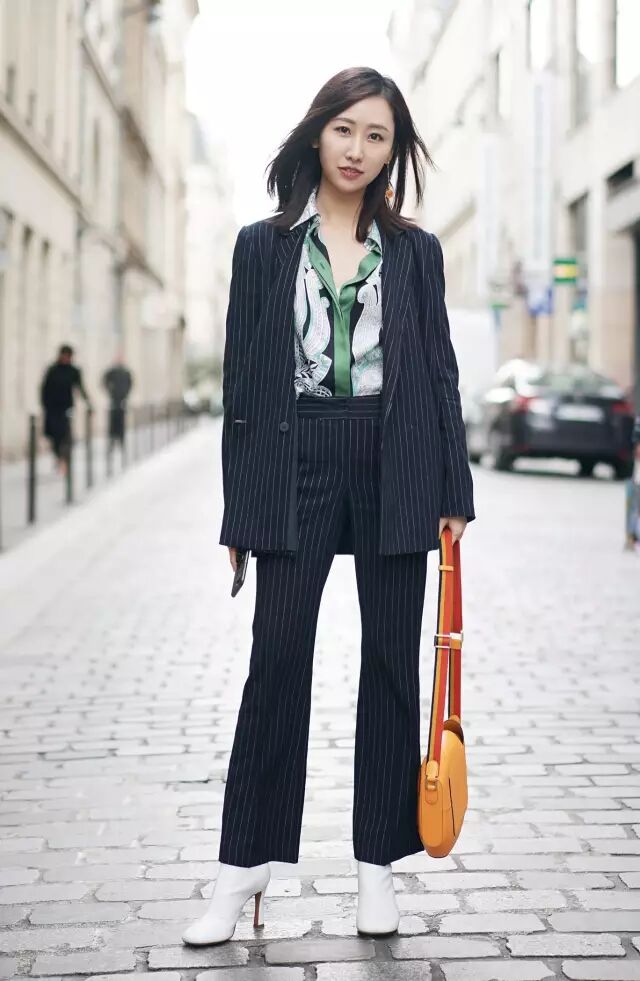 在巴黎时,去参观爱马仕的皮革手工坊时,我穿了下面这套西服。藏蓝色竖条纹看起来是不是很行政的款式?所以我选了绿色的印花真丝衬衫,配了一双白靴子,希望看起来没那么正式,也更有春天气息。这套西服穿上身蛮舒服的,裤子有一点微喇叭的设计,对哈比人很友好。▼