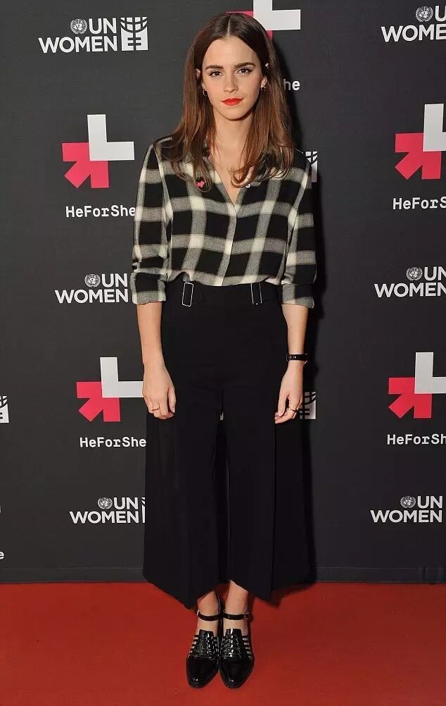 虽然我不是很喜欢理工男最爱的格纹衬衫,原因是太难穿得好看了。不过Emma这身我还蛮喜欢的。黑白格纹衬衫搭配黑色阔腿裤,脚上还踩着一双不露趾的罗马踝带鞋,穿出了学生感,蛮有活力的。平时想轻松一点上班的,就可以模仿这套搭配。▼