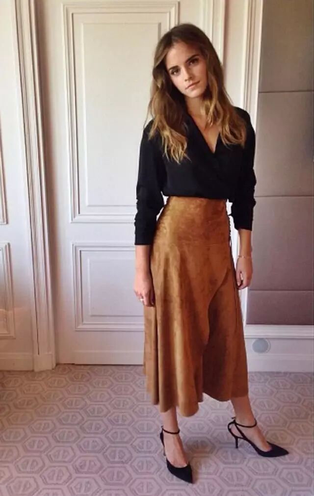 黑色裹身上衣搭棕色麂皮迷笛裙这身也是不枯燥的职业装造型。裙子是高腰收腰的款式,既显身材,又能拉长下半身比例。裙子波浪边的剪裁还增添了一丝温柔。▼
