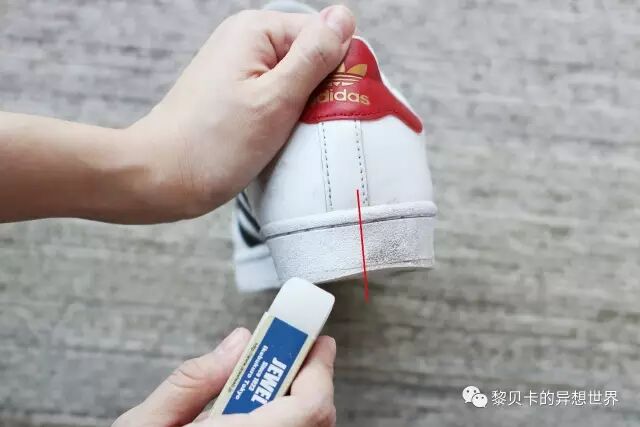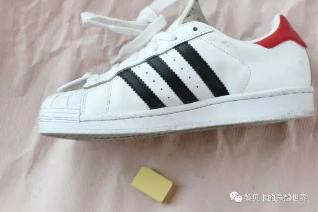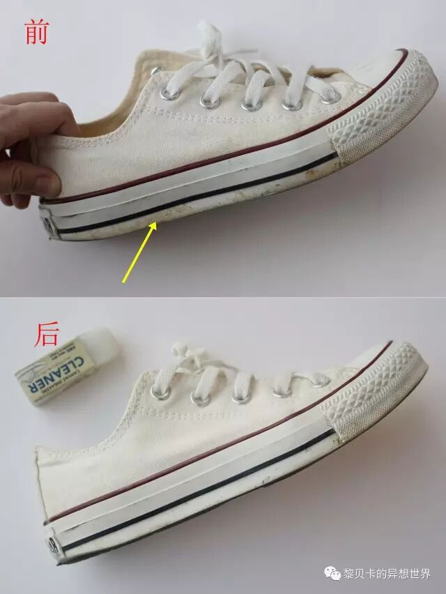 用来清洁帆布和鞋边橡胶的部分,效果很好。擦的时候要稍微用点力,轻微的泛黄也能擦掉。对比很明显~▼
