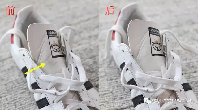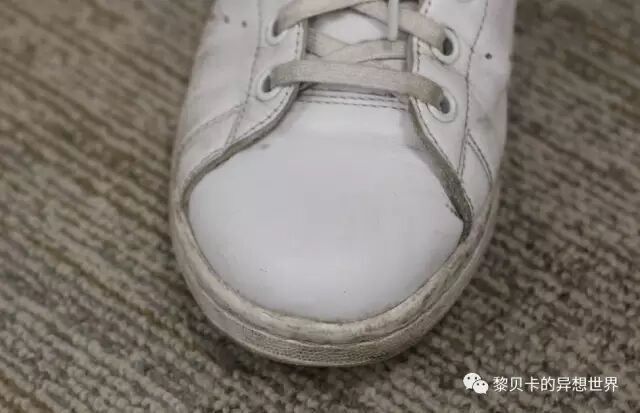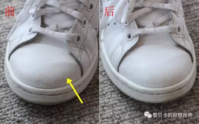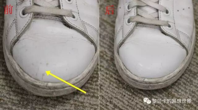看看某位贤惠的助理小妞(猜猜是谁),拿她男票的Zara人造革小白鞋做的实验,左边是拿牙膏刷过的,鞋面很明显干净了不少。▼