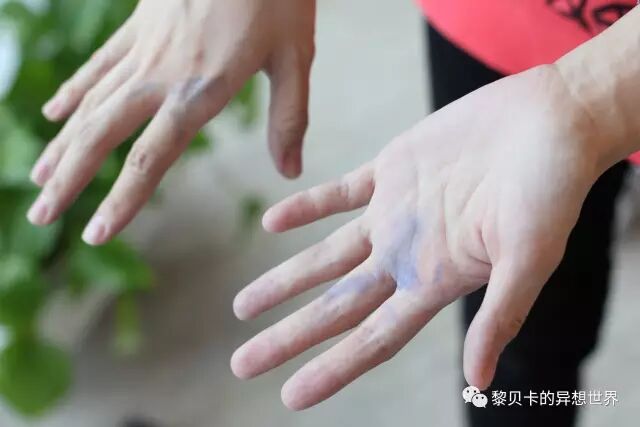 助理小妞把鞋子拿出来后还用手把鞋面的水拧干,弄完后发现双手都变蓝了,应该是沾到鞋子表面的蓝色浮色了。建议戴上手套来拧。▼