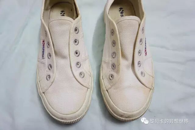 实验对象是助理小妞JOY的surperga帆布小白鞋,这双鞋她穿了大半年,穿得蛮脏的,鞋边有几处明显的污迹,还有一点发黄。▼