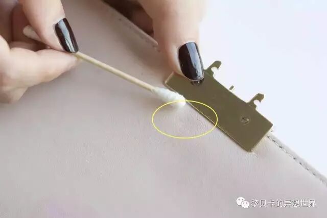 很多皮具护理品牌都有出专门的专用清洁剂。小面积污渍,可以用棉签 专用清洁剂重点处理。