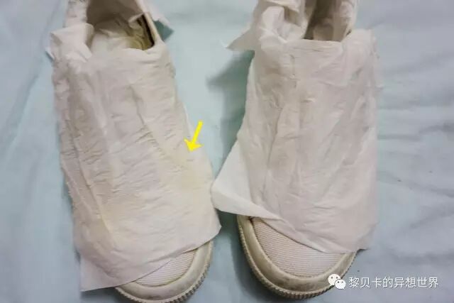 记得小时候体育课穿的白布鞋,妈妈每次帮我洗完都会拿纸巾包在鞋面上,然后再放到阳台去晾,晾干后再把纸巾取下来,纸巾变得黄黄的,而鞋面就很亮白。
