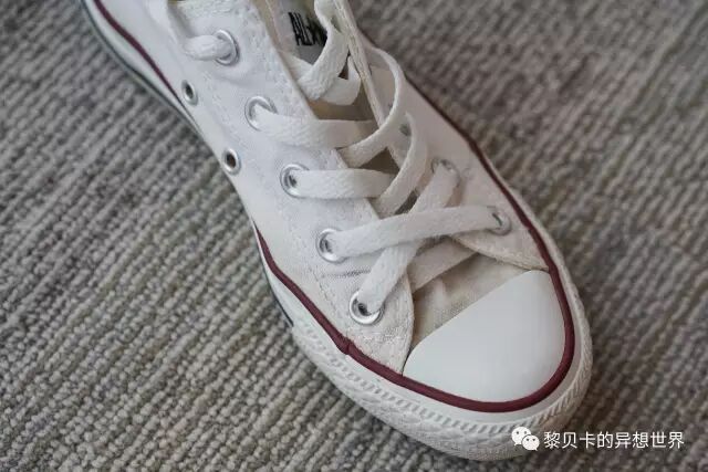 不知道你们有没发现,帆布小白鞋放一段时间没穿也很容易变黄,莫妮卡的这双匡威帆布鞋,过了一个冬天后从鞋柜里拿出来就发现,帆布已经泛黄,洗也洗不掉,也是很头痛。▼