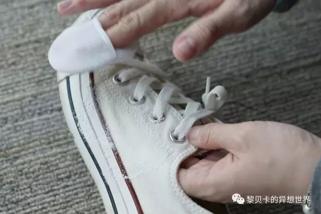 莫妮卡那双发黄的匡威,在蓝墨水实验前,我也拿来拯救了一下,效果惊人,你们看看~▼