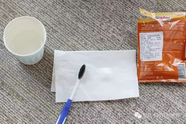 实验工具:小苏打、中性洗衣粉、软毛牙刷、清水
