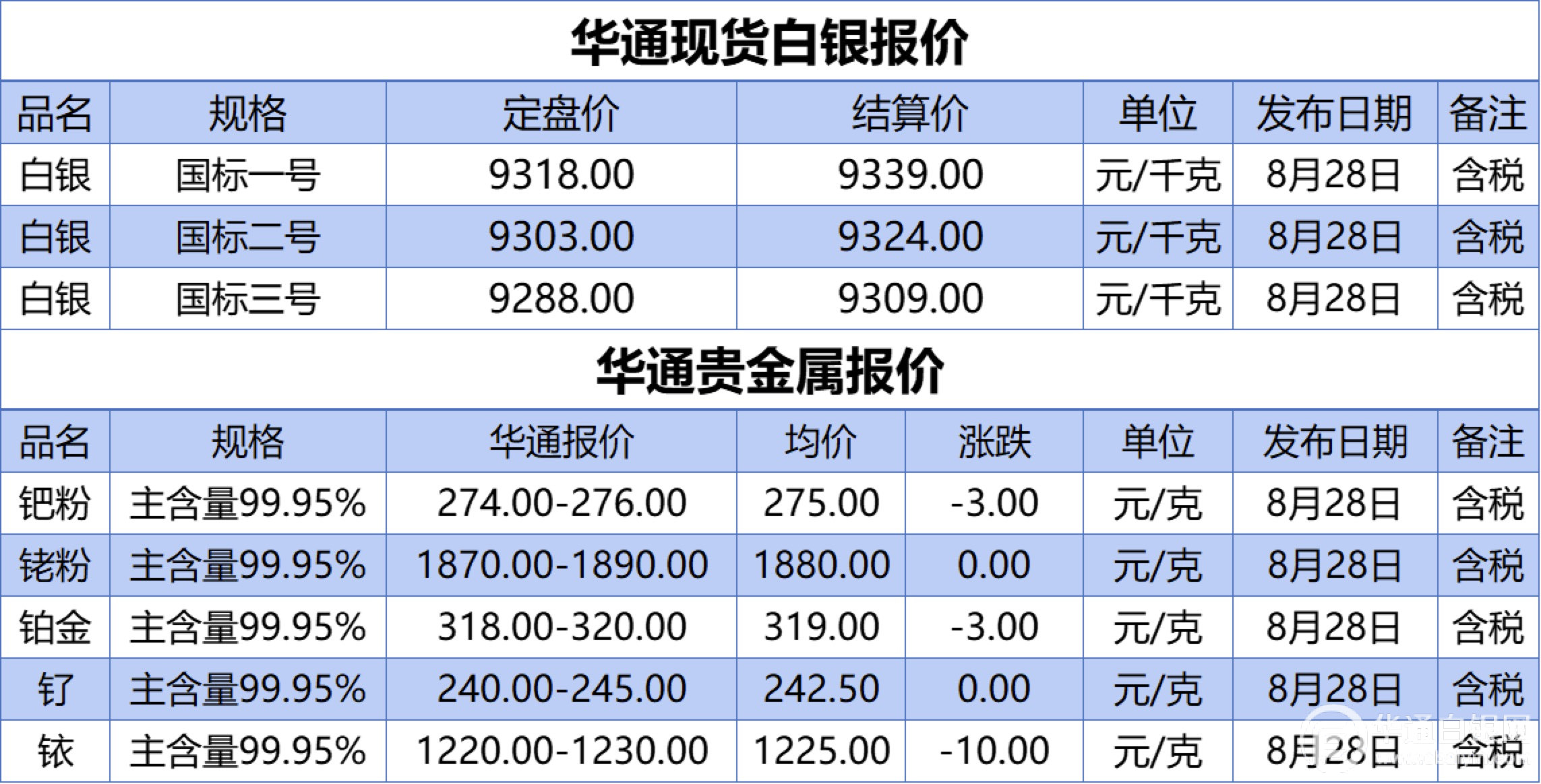 上海华通现货白银定盘价、贵金属报价(2025-08-28)