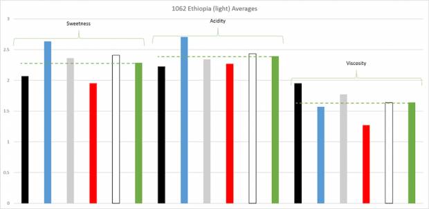 受测试者感知蓝色咖啡杯中咖啡(埃塞俄比亚浅烘焙咖啡)的甜度,酸度(平均值)最高。另外一个趋势是:对于埃塞俄比亚深烘焙咖啡,黑色咖啡杯有助于提高对酸度,甜度,尤其是粘稠度的感知,相反红色咖啡杯起到的影响作用最少。