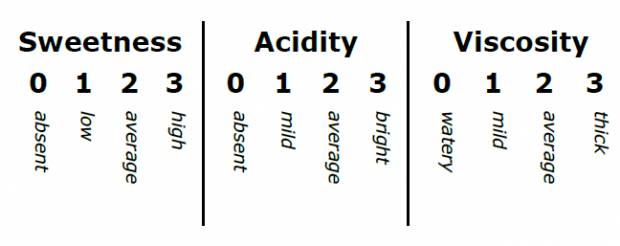 本组实验比较复杂,4支咖啡,5种不同颜色的杯子即20个测试样品,每个样品有3个特征(甜度,酸度,粘稠度),强度有0-3.