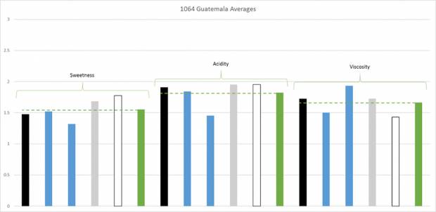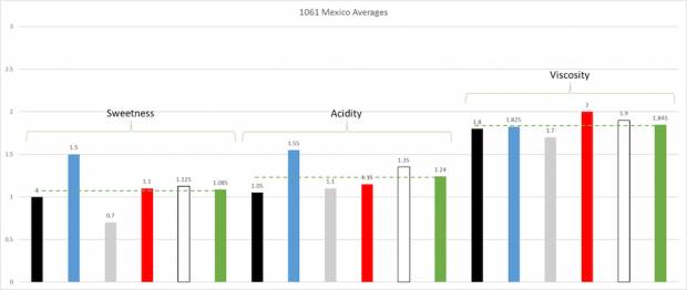 图中有5个颜色柱形,分别对应5个不同颜色的咖啡杯,灰色代表透明玻璃杯。受测试者感知蓝色咖啡杯中咖啡(墨西哥咖啡)的甜度,酸度(平均值)最高,这种现象/趋势也发生在浅度烘焙的埃塞俄比亚咖啡。