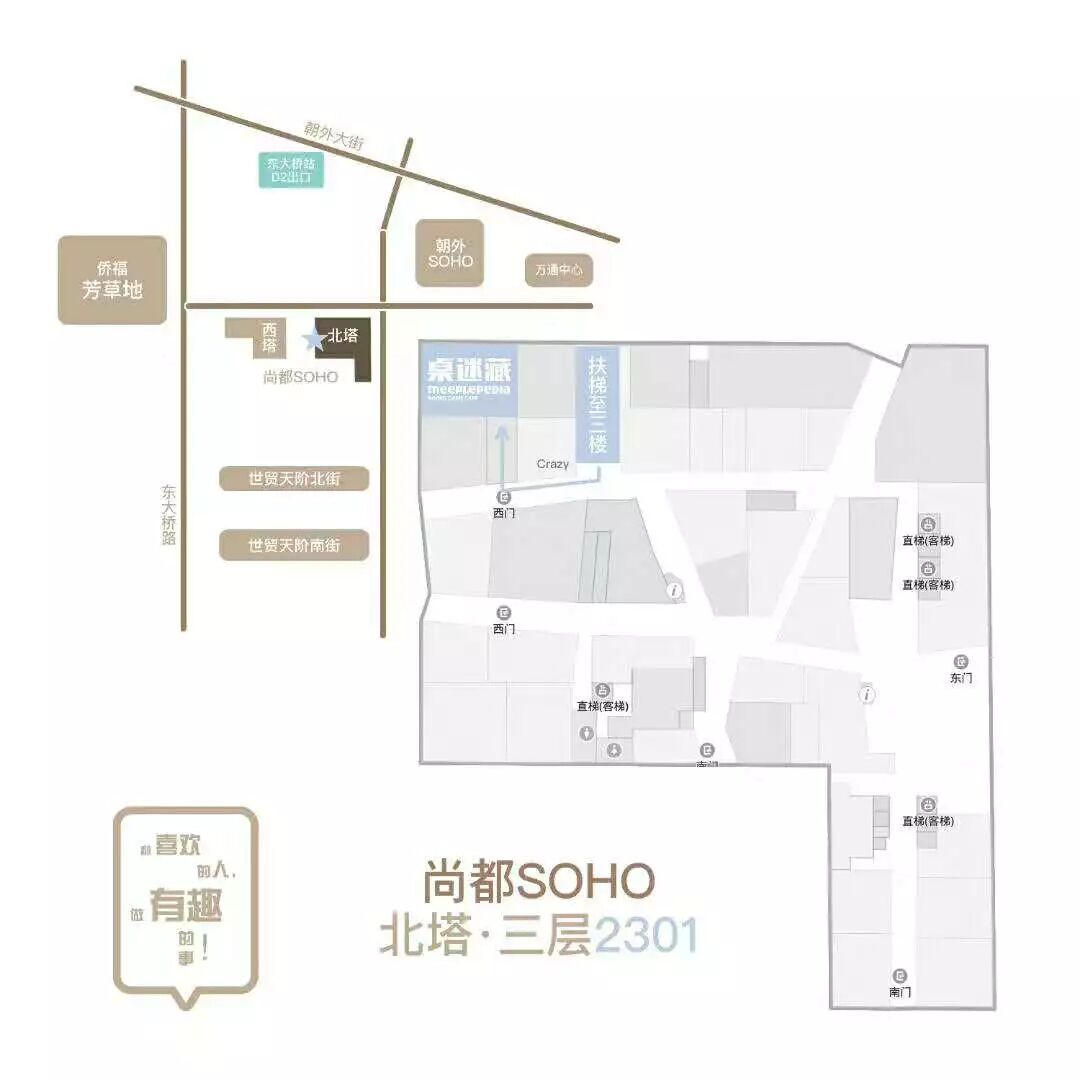 [捉迷藏]地址:东大桥路8号SOHO尚都北塔3层2301,位于世贸天阶北侧,近东大桥地铁站