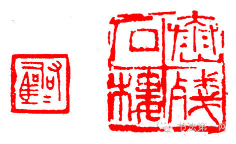 这是指印文字体大小的一种处理方法,即将印文作大、小的对比处理,求得章法上的虚实疏密呼应,从而产生节奏韵律感。如吴昌硕的“陶文冲五十以后书”一印的大、小字对比,和留空错落呼应的处理,十分成功,富于节奏和韵律。