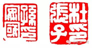 为求得印章的疏密合意,天机别启,将章法某处作分“离”,使之结构宽展,某处作“合”,使之结构团结、紧凑,从而使全印彼此制伏而统一协调。或将印文结字作离合处理,或将印文与边框作离合处理,或将印文与印文之间作离合处理。