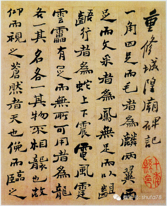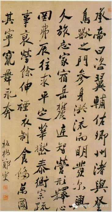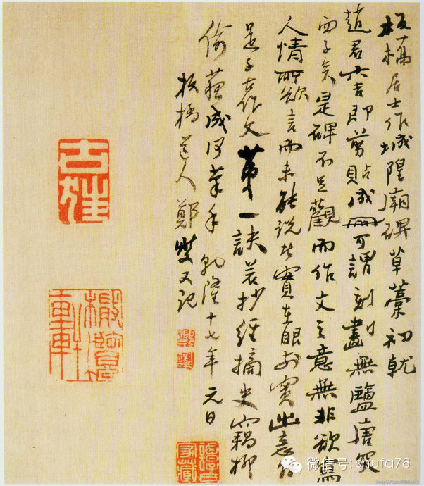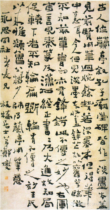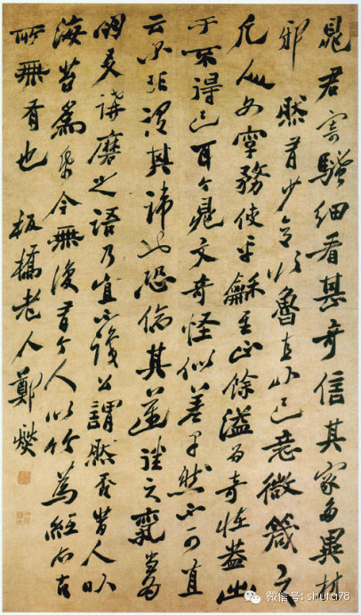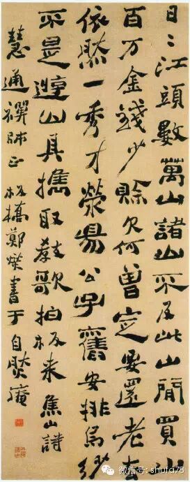 表面上看,郑板桥书法的这种创新,是一种杂凑,而实际上这是以他对传统书法的深厚理解为基础的。他对于“二王”以及颜真卿、苏东坡、黄庭坚等人的书法,对篆隶和魏碑都有很深的研究,但他对古人法帖的学习,是取神遗貌,决不求形似。他说:“黄山谷云:‘世人只学兰亭面,欲换凡骨无金丹。’可知骨不可凡面不足学也。况兰亭之面,失之已久乎!板桥道人以中郎(蔡邕)之体,运太傅(钟繇)之笔,为右军(王羲之)之书,而实出己意,并无所谓蔡、钟、王者。岂复有兰亭面貌乎?古人书法入神超妙,而石刻、木刻千翻万变,遗意荡然。若复依样葫芦,才子俱归恶道。”(《跋临兰亭序》)他对学书的这种独到见解,加上他对诗、画都有很高的造诣,生活中又饱经沧桑,所以,将思想的旷达与天性的幽默一齐融会与笔端,自然就形成了这种“奇而不诡正”的书法特征。