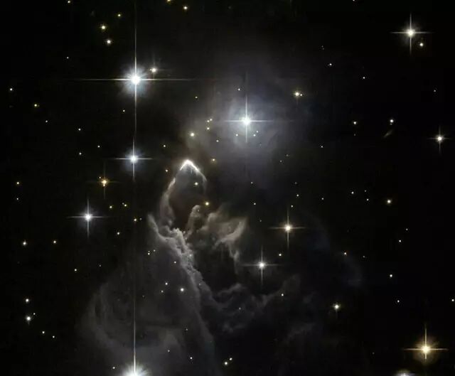 来自哈勃太空望远镜“星云红外天文卫星05437 2502”的快照。金牛星座中的这一不寻常的星云.其主要特点是明亮的弧线,勾勒出星际尘埃的上边缘。