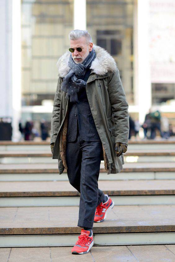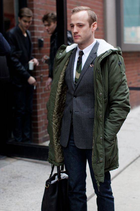 如果你穿了一套色彩比较活跃的正装,那在Parka的颜色上也可以适当的选择一些浅色调。
