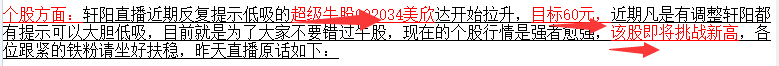 13:56:此处掌声可以来的更激烈点,轩阳近期反复点评,下午开盘再次点评推荐的超级牛股002034美欣开始放量大涨6%,目前已经拿下新高,距离目标价60元更进一步了,再次恭喜低吸的铁粉,刚刚直播原话如下: