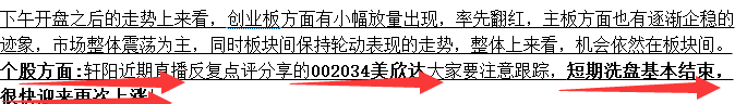 13:26:个股方面:轩阳直播近期反复提示低吸的超级牛股002034美欣达开始拉升,目标60元,近期凡是有调整轩阳都有提示可以大胆低吸,目前就是为了大家不要错过牛股,现在的个股行情是强者愈强,该股即将挑战新高,各位跟紧的铁粉请坐好扶稳,昨天直播原话如下: