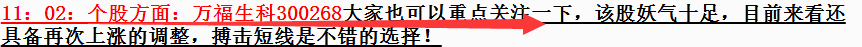 10:10:可喜可贺,轩阳上周五直播重点点评分享的万福生科300268今天表现非常不错,上周就说过该股妖气十足,目前逆势拉升三个点就是最好的证明,周五实盘原话如下: