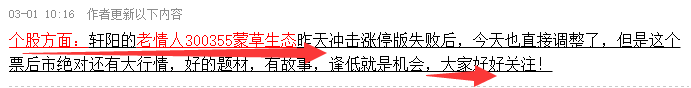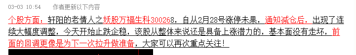 11:25:个股方面:轩阳周一再次提示各位低吸的老情人之万福生科300268关于公司股权协议转让过户停牌,大家好好跟踪一下,复盘后或有大惊喜,3月3号直播原话如下: