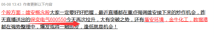 13:58:可喜可贺,周三直播和周四直播明确点评推荐的雄安概念股之保变电气600550午后火箭发射,快速封死涨停,轩阳实战一直被模仿,从未被超越,周四明确提示到该股突破在即!轩阳说到做到,牛股还将继续送出,大家请盯紧直播,接下来的目标还是雄安概念股!直播原话和实盘操作如下: