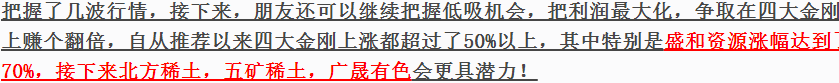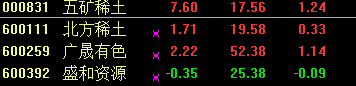 14:52:可喜可贺,轩阳对直播重点打造的有色四大金刚的把握能力够强大吧,每次直播点评提示可以考虑低吸后,即可会有表现,尾盘有色的这波拉升让人神清气爽啊,五矿稀土000831大涨8%,北方稀土600111,广晟有色600259也拉升两个多点,盛和资源都翻红了,大家可以回顾下午盘对有色概念的点评哦!