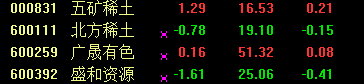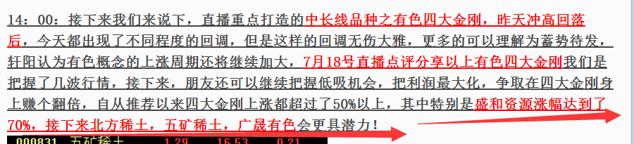 14:32:此处掌声可以来的更激烈点,轩阳对有色概念股把握够强吧,午后点评后,目前开始快速拉升了,其中五矿稀土000831大涨4%,北方稀土600111,广晟有色600259纷纷翻红,盛和资源也在拉升中,想赚钱的铁粉,可以紧跟随直播,因为轩阳直播从来不缺牛股,而且牛股都是推荐在对的时间点,有色前面的一波拉升,也是轩阳点评后就开始爆发的,大家可以查看前面文章便知真假!午间直播原话如下: