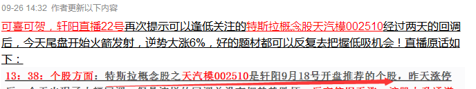 10:45:此处掌声可以来的更激烈点,直播老情人之特斯拉概念股天汽模002510即将冲击涨停板,22号直播就明确强调,该股回调后就是机会,果不其然,经过两天的回调,该股再次迎来主升浪行情,还好轩阳25号尾盘就开始潜伏,目前收益非常乐观,国庆节的开销全部都有了,同时也要恭喜有一起低吸的铁粉,同样收益巨大!直播原话如下:
