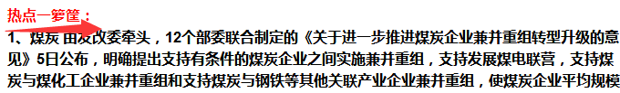 10:32:今天早盘热点一箩筐对煤炭板块方向的消息面提示:说了三只股:潞安环能、山煤国际和西山煤电,目前这三只涨幅最大。消息刺激是:实施兼并重组,支持发展煤电联营,资金扎堆煤炭,近期有一个现象太明显了,就是题材方向,如果前期有热度有过大幅炒作,出个利好,集体高潮,但前期市场没有记忆出个利好也就是高开下,但权重方向出个利好,资金就爱去追捧,往往就是大热的局面,比如煤炭、地产、航空、水泥等偏中盘股。早盘原话如下: