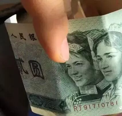 下图是一张有3道折的贰元纸币,号码为RJ91710781。