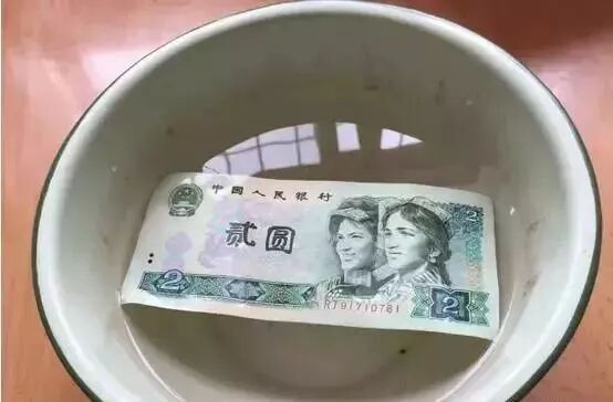 将这张带有3道折痕的纸币下水浸泡。